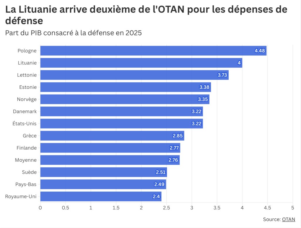 Dans cette région longtemps placée sous le joug soviétique, la menace russe n’a rien d’abstrait. La Lituanie, frontalière de la Lettonie et de l’Estonie, est elle aussi touchée par ce type d’incursions. La semaine dernière, un drone ukrainien s’était déjà abîmé dans un lac en Lituanie alors que les forces ukrainiennes avaient visé le port russe de Primorsk. Ce rappel brutal de la menace russe conforte Vilnius dans sa politique de renforcement de son appareil militaire. En 2026, la Lituanie consacrera 5,4 % de son produit intérieur brut à sa défense, soit près de 5 milliards d’euros. À titre de comparaison, cet effort s’élevait à environ 2 % en 2022, lors du déclenchement de l’invasion russe en Ukraine. Un investissement historiquement élevé qui place désormais Vilnius largement au-dessus de l’objectif des 2 % fixé initialement par l’OTAN. La France, ne consacre quant à elle cette année que 2,1% de son PIB à la défense, soit environ 55 milliards d’euros. Ce chiffre historique propulse également la Lituanie juste devant ses voisins lettons et estoniens, eux aussi engagés dans une course à l’armement pour sécuriser le flanc est de l’Alliance.