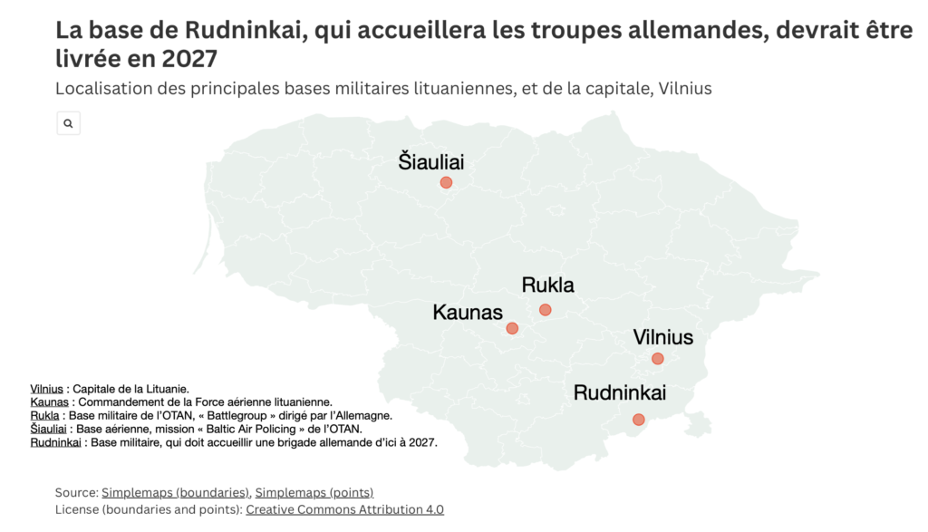 La Lituanie accélère également la construction d’infrastructures pour accueillir, d’ici à 2027, une brigade allemande permanente de 5 000 soldats. C’est la première fois que Berlin stationne autant de troupes en dehors d’Allemagne. Le projet nécessite la construction de logements, de bases et de terrains d’entraînement. Pièce maîtresse de ce dispositif, le site militaire de Rudninkai est en cours d’aménagement pour un coût estimé à 1,4 milliard d’euros.